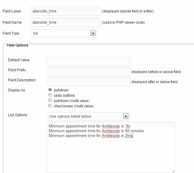 And of course if you added more minimum appointment times for other areas, you will get a whole bunch more of irrelevant text showing up in single record pages for other towns/cities/regions