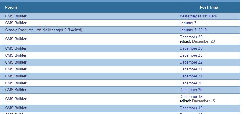 2) Discovered an oddity (not a major issue or a problem).  When I look at my profile's posts it appears they sort by the full date except posts from the Article Manager forum which appear to be showing up based on month/day only.  I attached a photo of a 2010 Article Manager post mingled in with my current posts so you can see what I'm talking about.