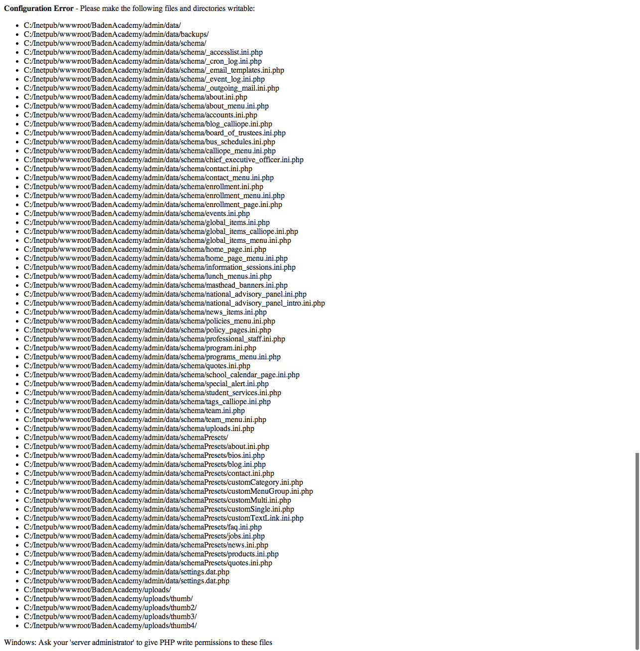 We just launched a website last week and everything was working properly on our development server, but when took it live on the clients server we started having some issues. I did some searching on the forums and found someone with this same problem and was told to just update the permissions. The client does not allow us to do that, they have to change the permissions and he is telling us everything is correct. Below is the error I get when I try and save the General Settings through the CMS. I can make changes manually through the settings code, but obviously should not have to.