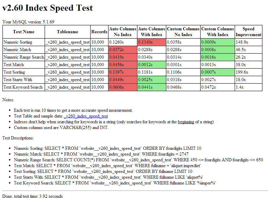 No, that's great. The plugin uses the same test data on every server. So you can see that when it uses the new features of "custom mysql column types" and "mysql indexes" you get a speed boost of between 7-109 times. So especially for queries that return a sorted list of results, you could run 100 queries in the same time it used to take to run one.