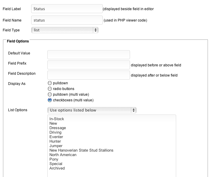 Using a copy of the Breeds display page (referred to above), I made a Status display page. For instance, if in the multi-check option "new" and "in-stock" are both checked, I would like that stallion's name to show up under both the "new" header and the "in-stock" header.  I've noticed the difference between the breed display page (above) and this one is that the breeds are chosen from a drop down list and only one breed can be selected, however, the status has many checkbox options that can be checked.  I tried "status", "status:values" & "status:labels" but nothing displays so I'm obviously messing that part up.