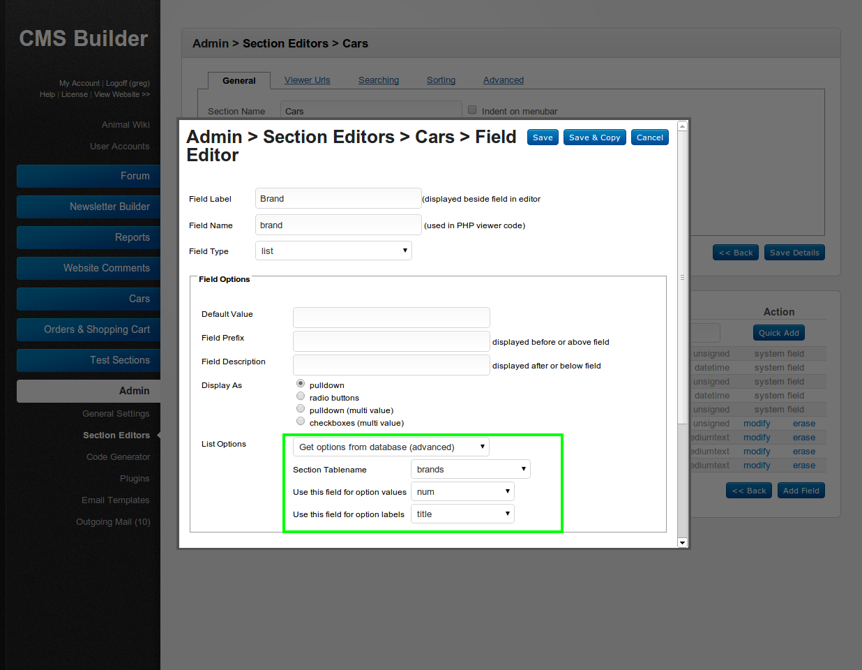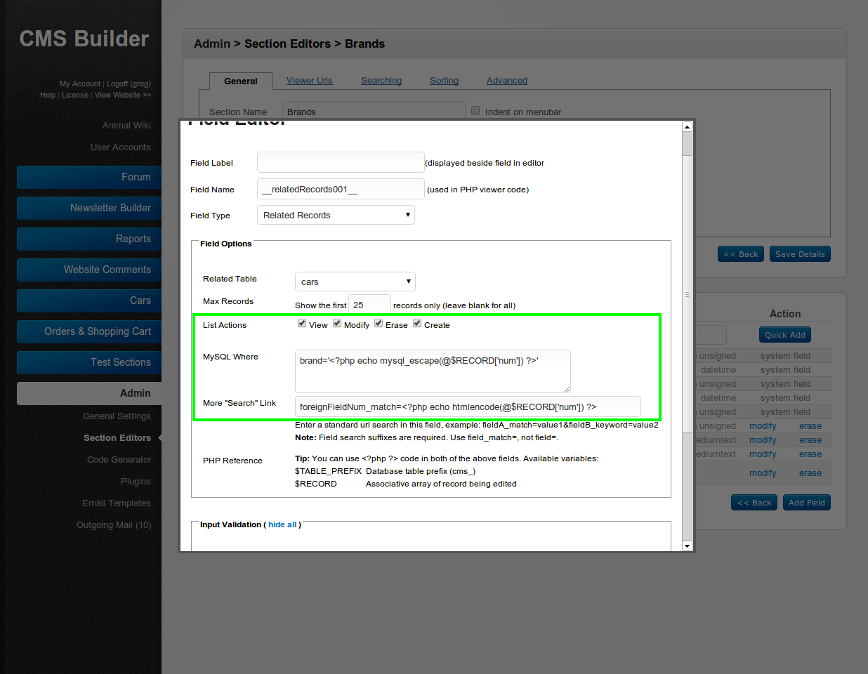 Next I set up the related record field, I select the cars section from the drop down, and then  update the MySQL where statement field with the field that stores the brand against each car (see related-record-field.png). I also checked the list action fields for the things I want users to be able to do from the list. In your case you might only want view.