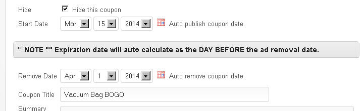 I've used removeDate, which makes the offers disappear when the date arrives. As you can see, the page above shows the expiration date. However, I'd like the ad to appear on this date, and disappear the next day. Is there a way to do this while still showing the correct expiration date on the page? E.g. Offer expires on April 30, but disappears on May 1.