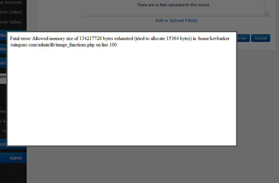 I am having trouble with uploads and am getting a Fatal error. Allowed memory size of 134217728 bytes exhausted (tried to allocate 15364 bytes in /home/kevbarker/raingonc.com/admin/lib/image_functions.php on line 100.