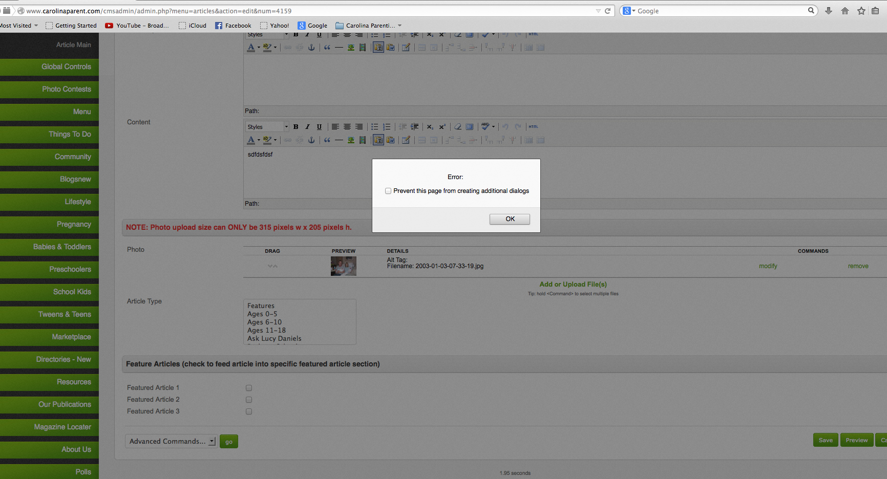 The issue we are now having today is that we cannot delete/remove any photos within the CMS. When we try to do this, we get an error. The strange thing is that if you close the error box and then hit the save button afterwards, the photo will be removed. I have attached screenshots of error box.