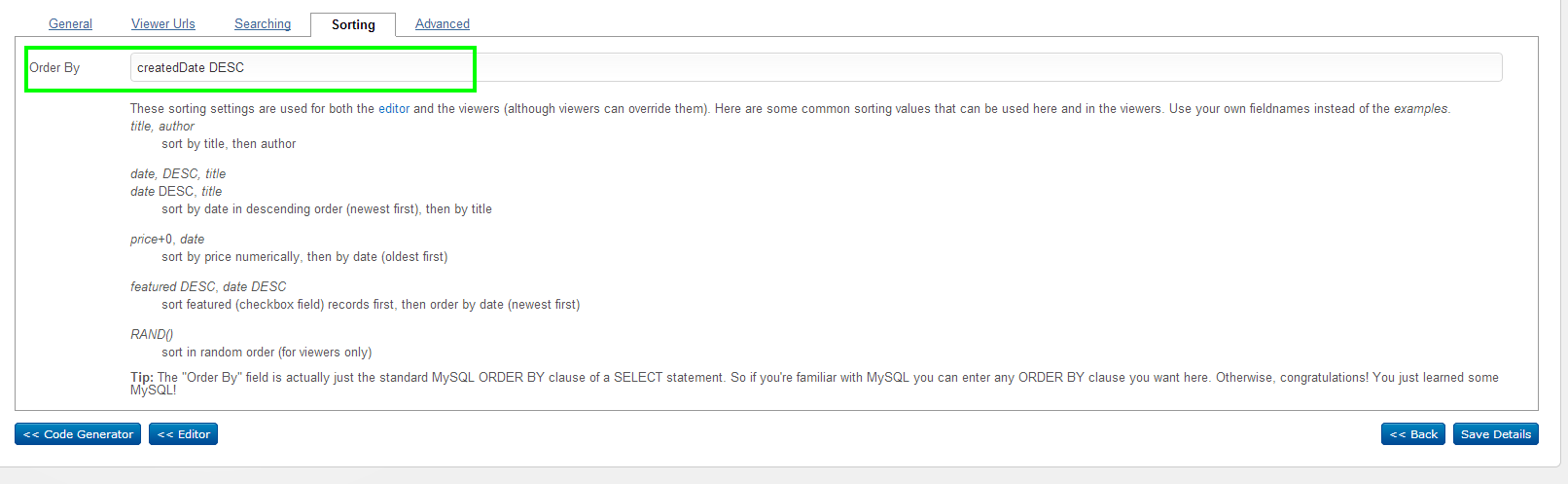 The orderBy variable should contain a MySQL ORDER BY string. You can read about it here: