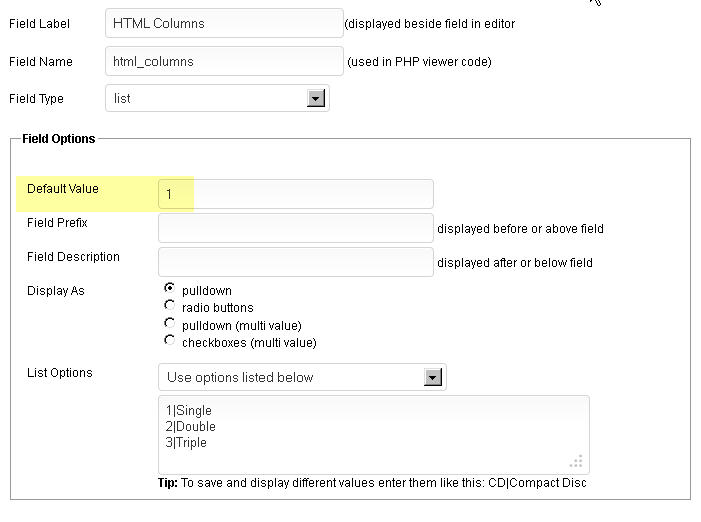 I'm trying to set a default or selected option in a pulldown list inside the cmsAdmin. Basically, I have a list of five options and I want the first option in the list to be preselected in the dropdown (NOT the default "<select>"). See the attached image.