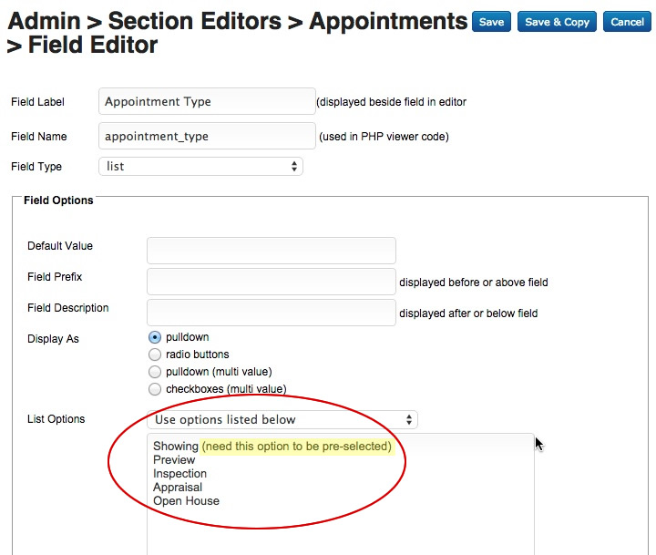 I'm trying to set a default or selected option in a pulldown list inside the cmsAdmin. Basically, I have a list of five options and I want the first option in the list to be preselected in the dropdown (NOT the default "<select>"). See the attached image.
