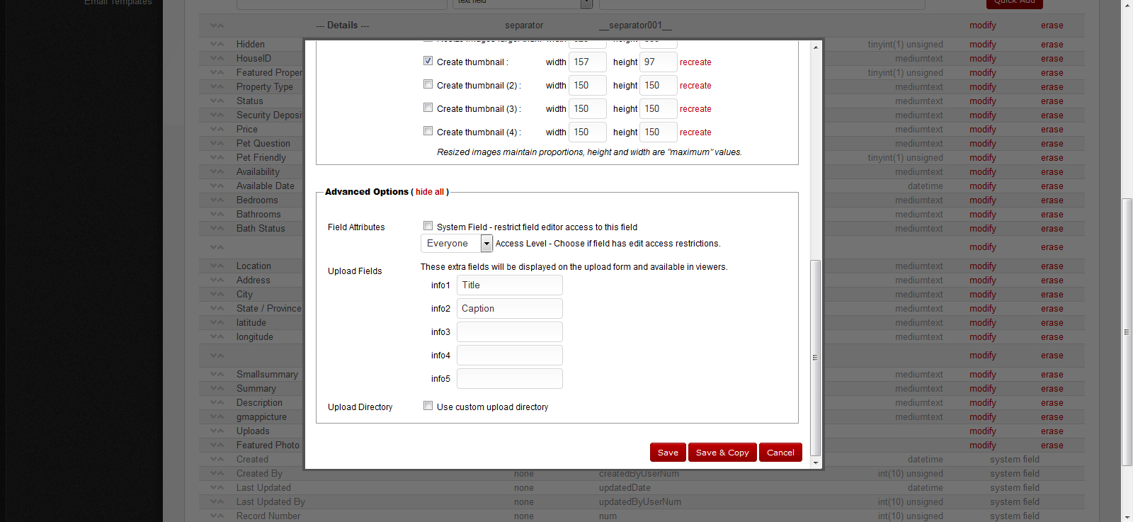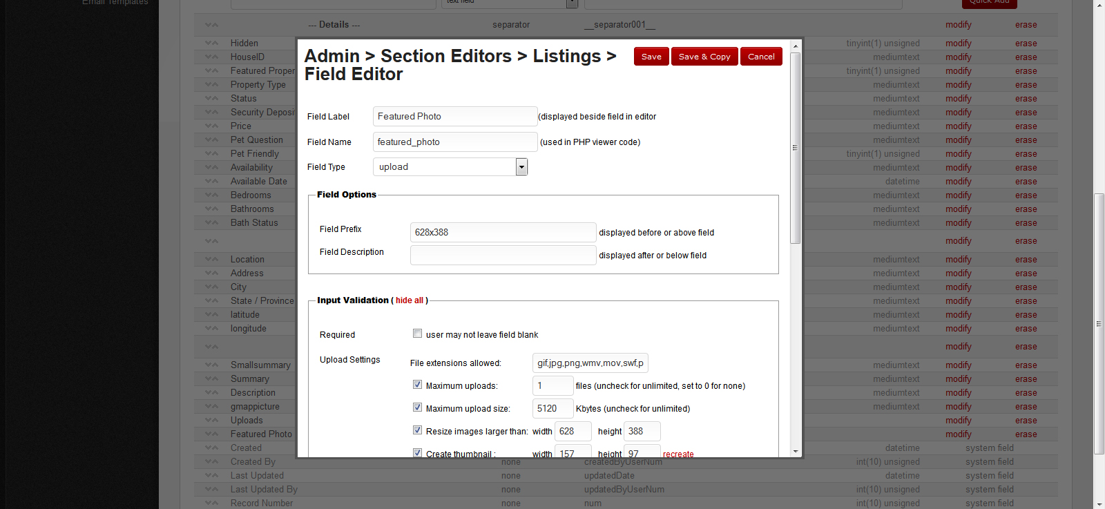 How I have it set up in the CMSB is under the Section Editors > Listings > I have a new Field Label named Featured Photo and Field Name is