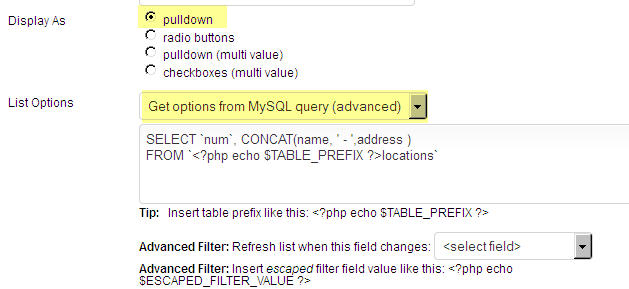 i don't know if this is possible with the "get options from MySQL query (advanced)" or if that has nothing to do with display.