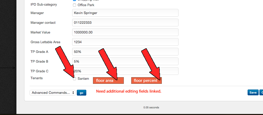Then in your properties section, create 2 new standard, pull down, single value list fields, called “Floor Area” and “Percent Occupied”, in which the list values are a list of floor areas (500, 1000, 1500, 2000, 2000, etc.) and percentages (10, 15, 20, 25, 30, etc.)