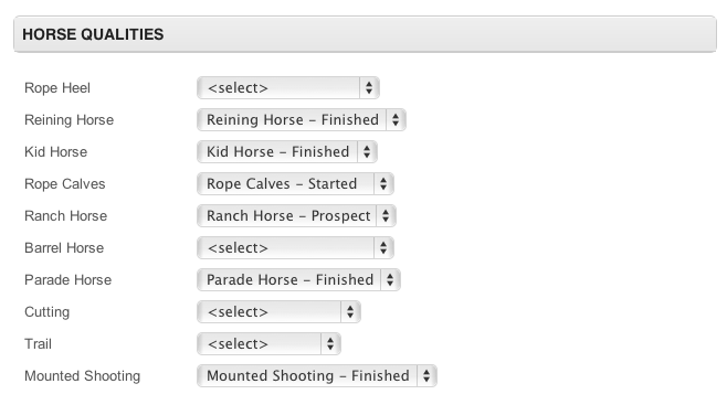 What I have is a list of "horse qualities" on a detail page. Each quality has an option of three levels (Finished, Started or Prospect)