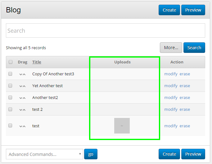 If you include the fieldname for the upload in the list page fields field, then a thumbnail of the first image uploaded will appear on the section list page, I've attached a screenshot that shows what the list page looks like, in my example the field name was uploads. If the file uploaded isn't an image file, the file name will be displayed instead.