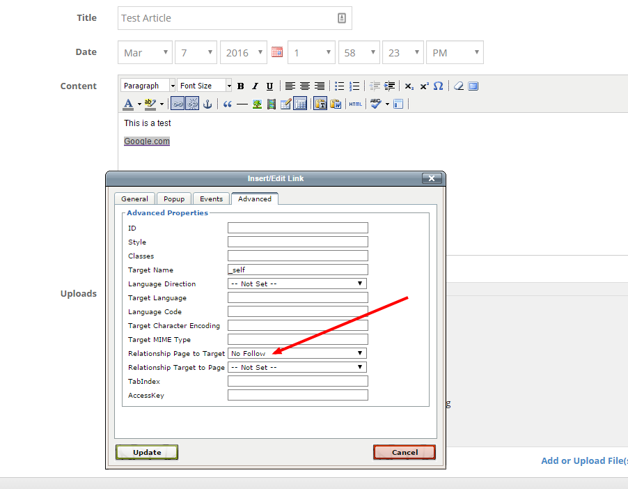 Add rel="nofollow" option to tinyMCE