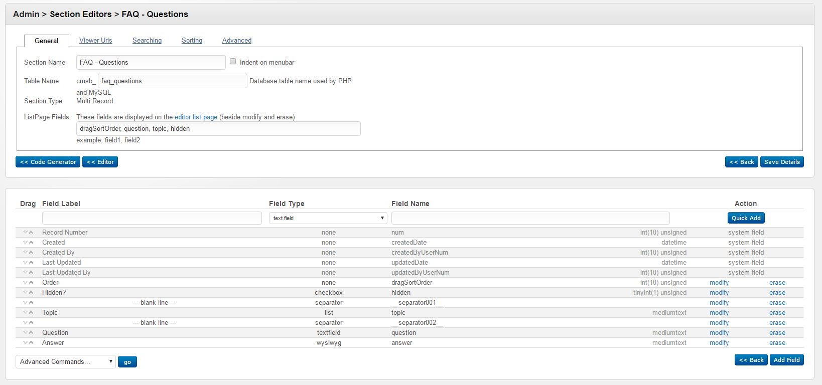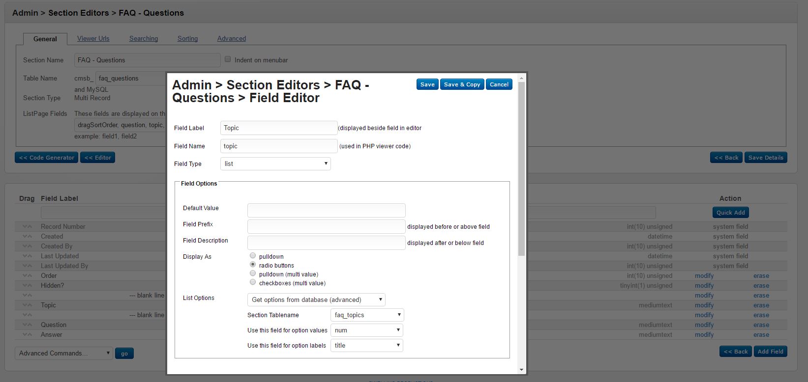 For this example, in CMSB, I have a multi editor where the client add questions (faq_questions) and they can select a category radio button which is supplied by a category multi-editor (faq_topics).