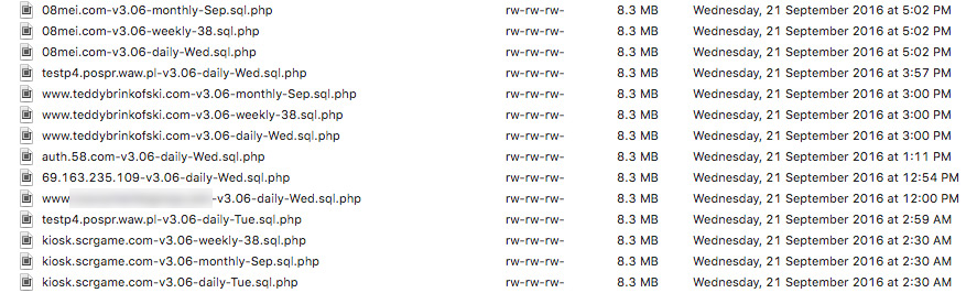 Just noticed something odd with the backup plugin for a client site. Backup is supposed to be daily but I'm seeing many backups each day each with strange file names which have spammy domain names included. See attached.
