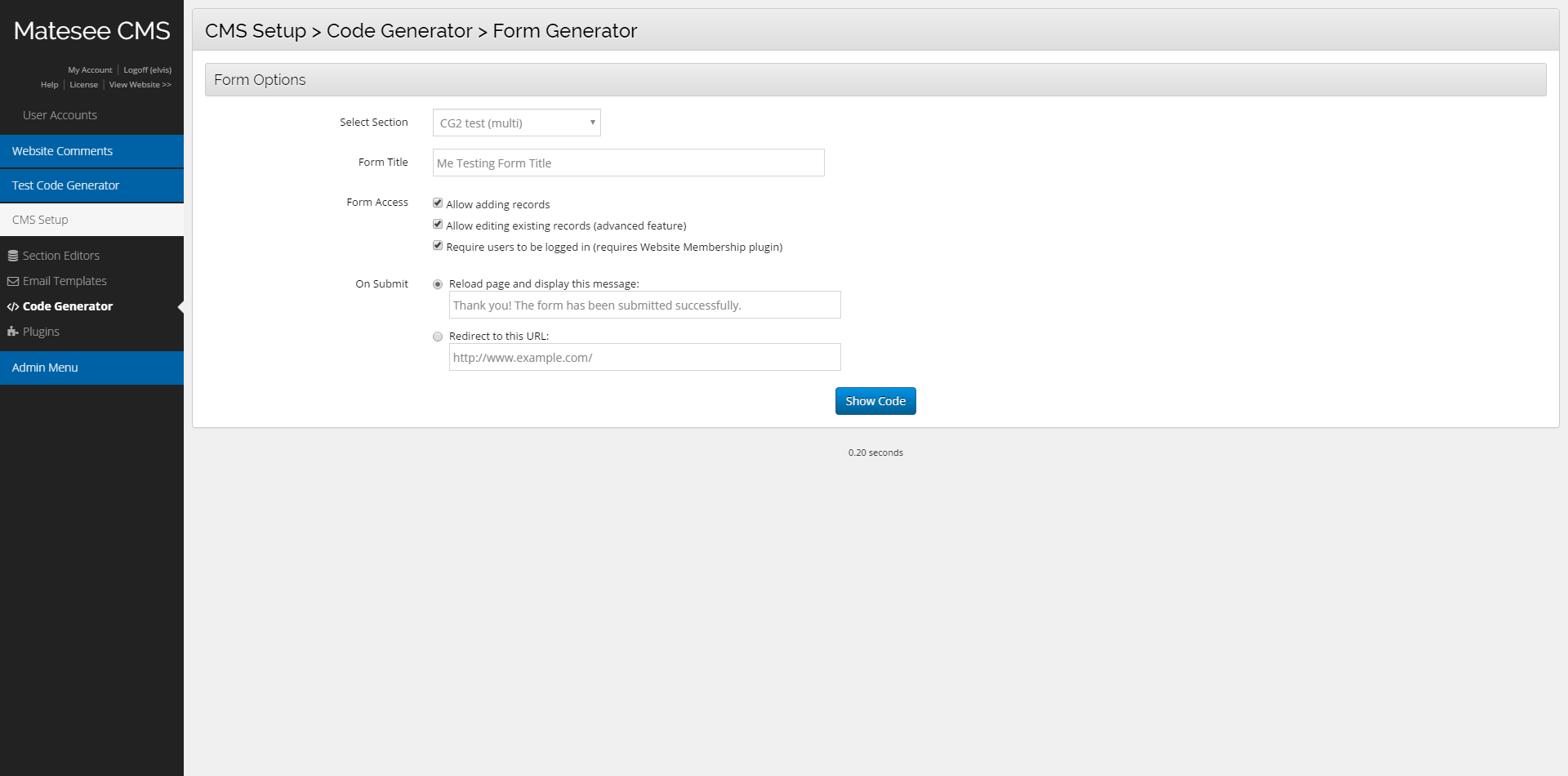 I go to CMS Setup > Code Generator > Form Generator and have it generate my form. Please see attached image 1.png.