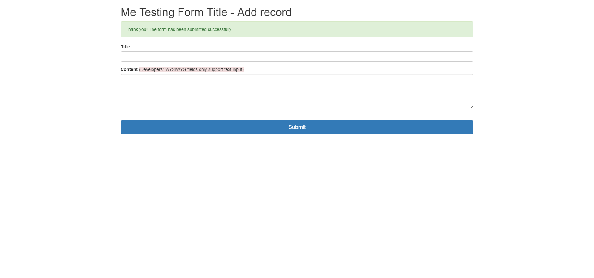 It works etc but when the "on submit" button is clicked and the form submitted the page reloads and I see the "Thank you! The form has been submitted successfully." with a blank form underneath. See image 2.png