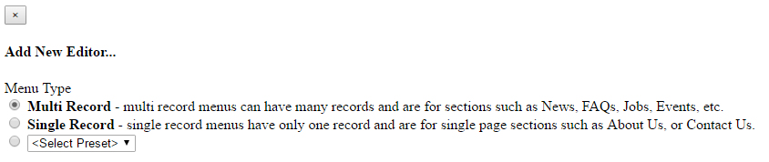 Single Record - single record menus have only one record and are for single page sections such as About Us, or Contact Us.