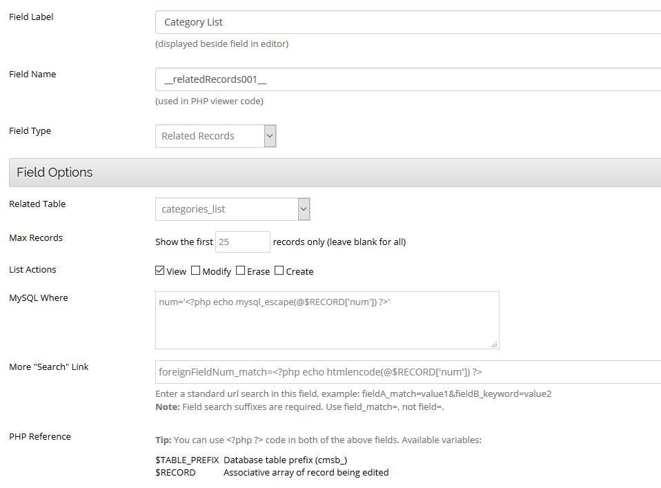 Note: I'm using "num" as the stored value, which means you'll need to look up categories like this: category=4, you can use text if you want. The benefits of using record numbers is that even if your text changes the records are still linked.