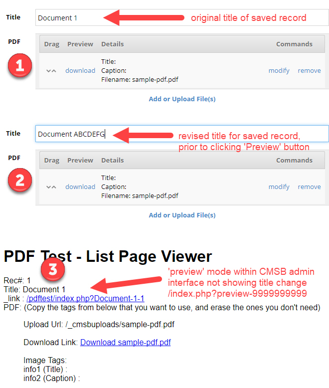 This is a multi-record section. When a change is made to an existing record field, the 'Preview' shown using the 'Preview' button within the CMSB interface does not show the update made to that field.