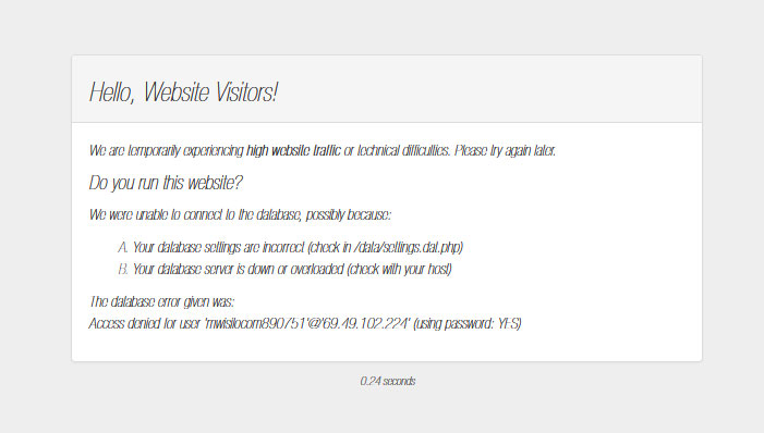 The actual error message is on the last line.  So what it means is that your database server is not allowing access to the username and IP address listed there.  So something has been changed somewhere.  You'll want to confirm your MySQL credentials haven't changed and manually updated them in /data/settings.dat.php