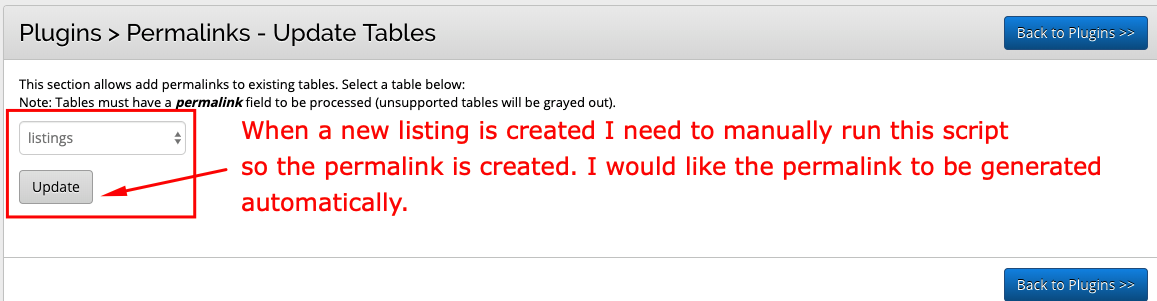 I have a front-end form for users to create listings. This works fine however the permalink for the listing is not generated automatically when the listing is created. I have to manually run the "Permalinks > Update Tables" script. See attached.