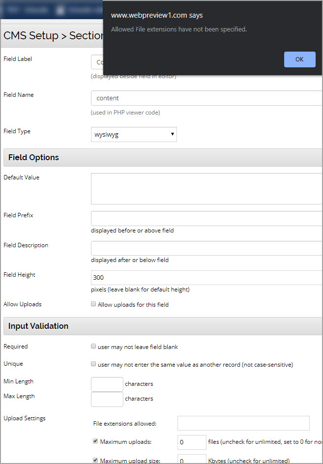 In version 3.53, when editing an existing WYSIWYG field, if "Allow Uploads" is not checked and there are no "File extensions allowed" entered, clicking 'Save' causes a modal popup "Allowed File extensions have not been specified" and it's not possible to save the record (see screenshot).