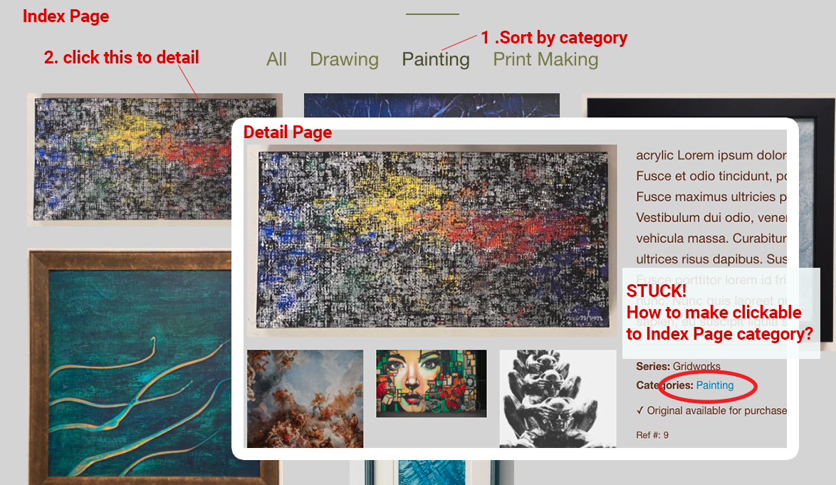 My struggle is on the detail page, itself. Under the artwork image I list out the categories that artwork is in. I would like those categories to be clickable and then the user can get back to the list page and see all the artwork in the categories. However, I can't figure out how to import the category permalink to the artwork detail page in order to make it a link back to the category page.