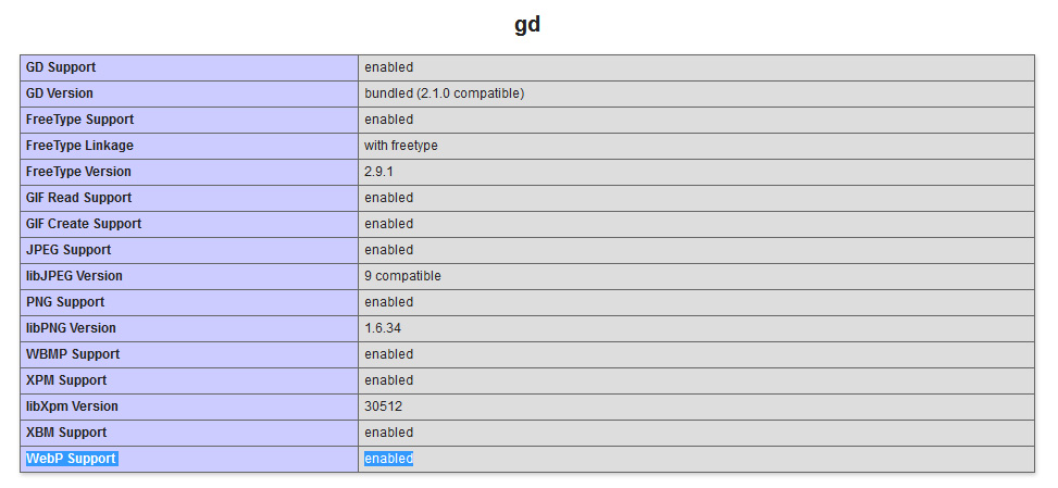 I've checked phpinfo() and get the same as your screenshot, WebP support is enabled.
