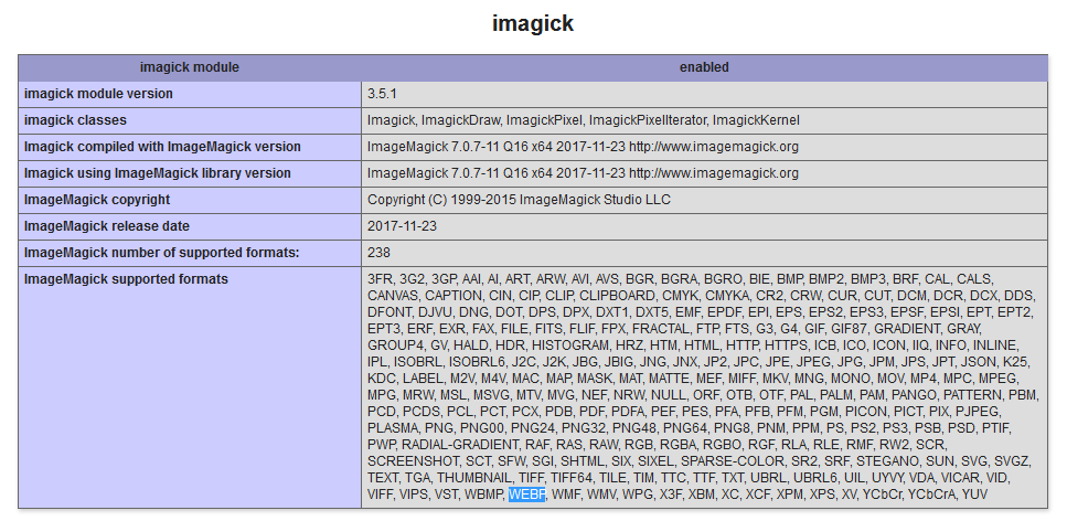 Can you check the Imagick section on the phpinfo() output to see if WebP is listed there?  I've attached a sample output of what we're looking for here.