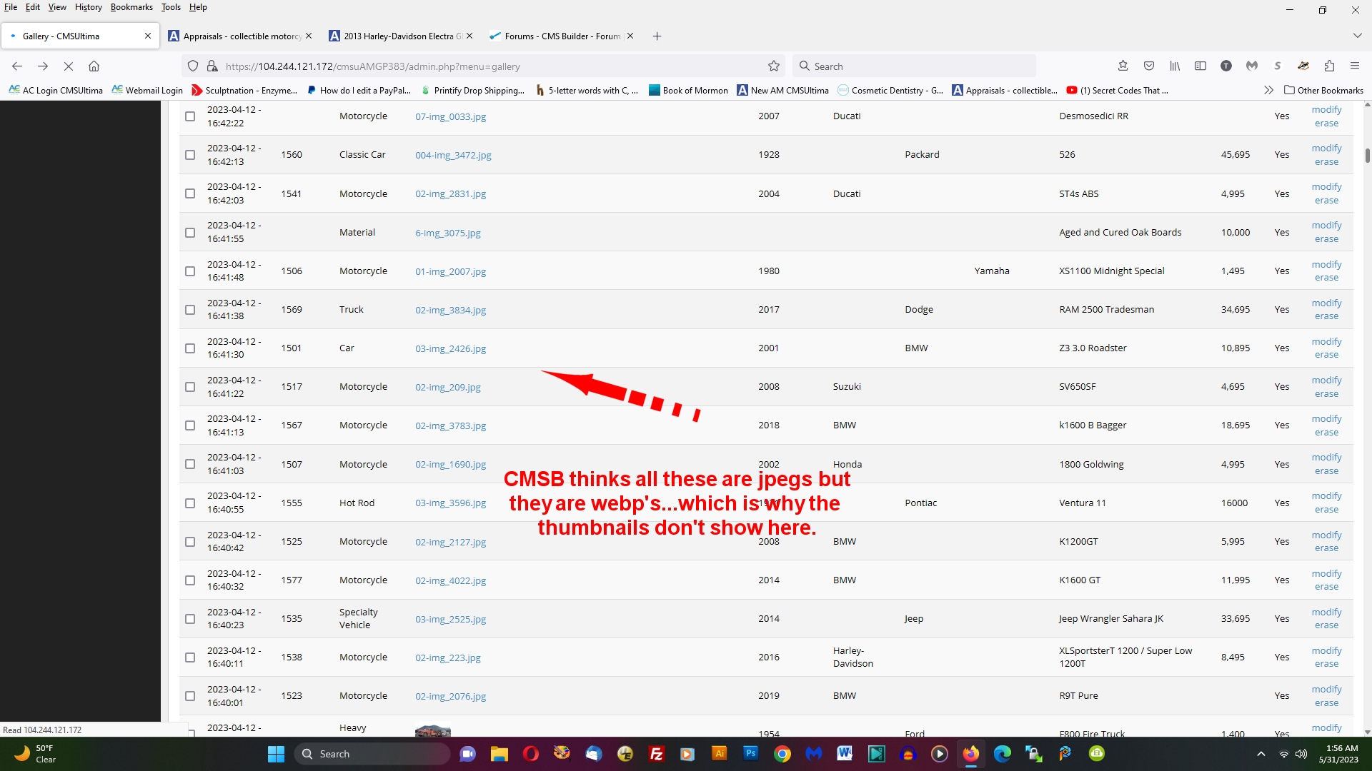 So, I had successfully  used the webp conversion on nearly 80,000 jpeg photos.  Then while prepping to move the site to a new host I basically overwrote the database unintentionally so the CMSB gallery listings reflects all of these photos as their jpeg versions, in name, but they are actually webp versions physically.  Screenshot below.  IF I go to a browser and try to view any of the images individually in a new browser window they will show if I change the file extension in the browser window to ".webp" instead of ".jpg" like the database thinks they are.