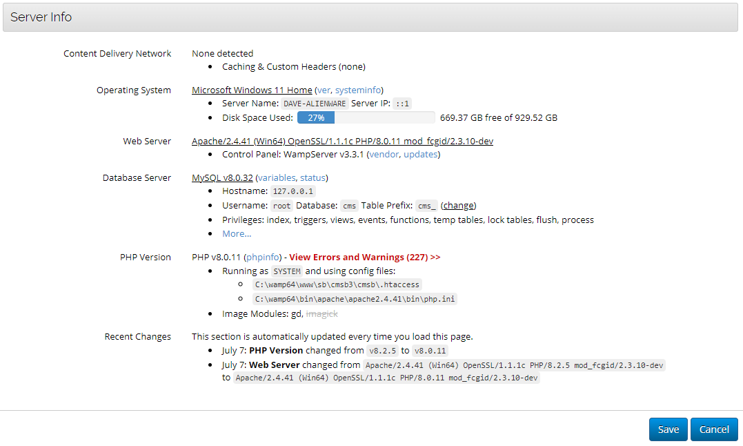 Admin > General > Recent Changes (Admin Panel): This feature tracks all recent server changes, including updates to the Content Delivery Network, Operating System, Server Name, Server IP, Web Server, Control Panel, Database Server, Database Details, PHP Version, PHP User, and CMS Version. This feature aims to help you identify when external factors might have caused problems or are affecting your system's performance.