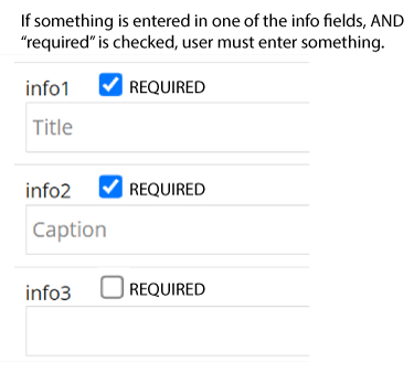 When entering multiple images or documents for an upload field, it's not possible to require one or more info fields (info1, info2, etc.). For images, this means the caption or "alt text" is empty. For documents, it's not possible to require a "Title for download link" to describe the download, so I default to something like "Download document" - not descriptive enough.