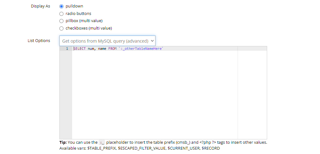Feature Request: Field Editor List Options - advance mysql query