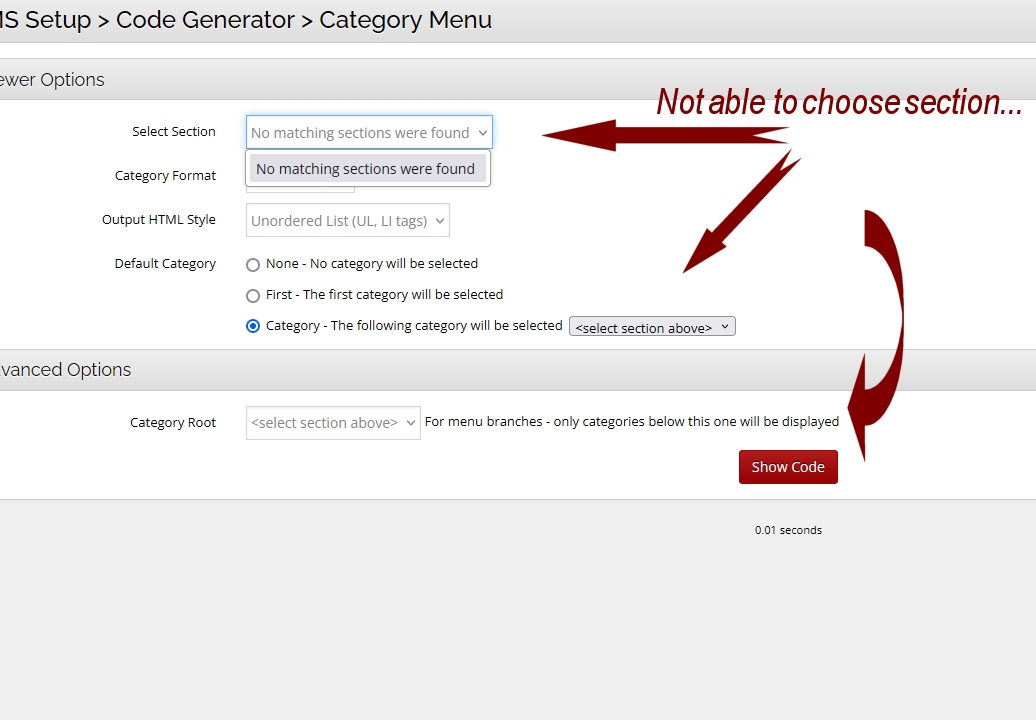 It worked as expected above, which is awesome; BUT when I attempt to use the code generator for building a category menu (screen shot 1) I am unable to choose any of the sections (categories or products) and generate the completed code (screen shot 2). I attempted to generate the category menu code on both the sections, but no bueno.