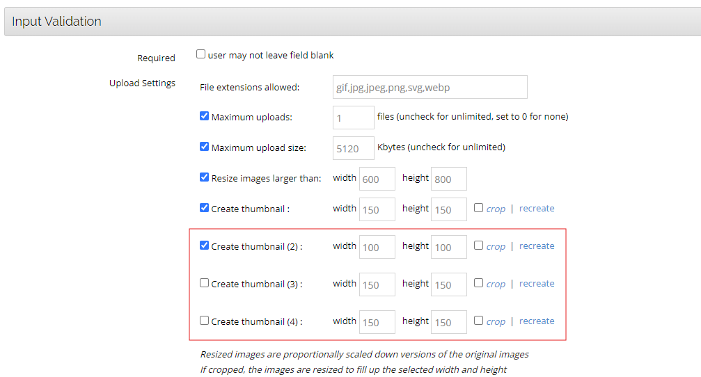 - Under input validation you will see sections for creating thumbnails. By default it looks like it only creates 1, but you can select to have it generate up to 4 and specify the dimensions for each. You could just make one of those 100 x 100 and it will generate a thumbnail image for each size you specified. I attached a screenshot.