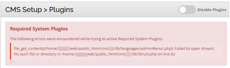When viewing CMS Setup > Plugins, the following error displays (screenshot attached):