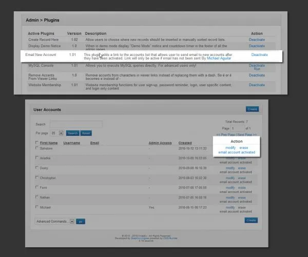 The Email New Account Notification plugin enhances the membership plugin. It will give administrators the option to manually send an email to new members from the user accounts list. With the Email New Account Notification plugin installed a link will be added to the user accounts list called "email account activated".