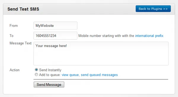 This plugin allows you to send SMS (text) messages from your website. While the possibilities are limitless, some example uses include informing or reminding users of time-sensitive promotions, their personal appointments, or important news.