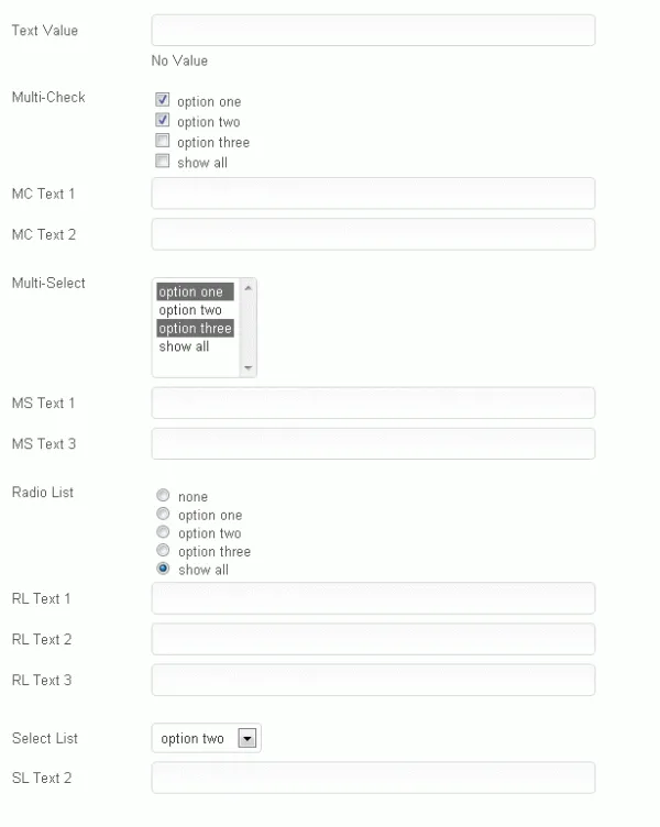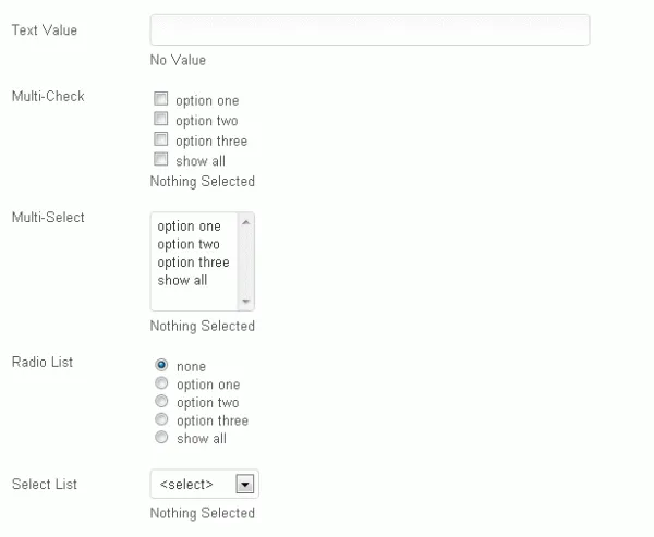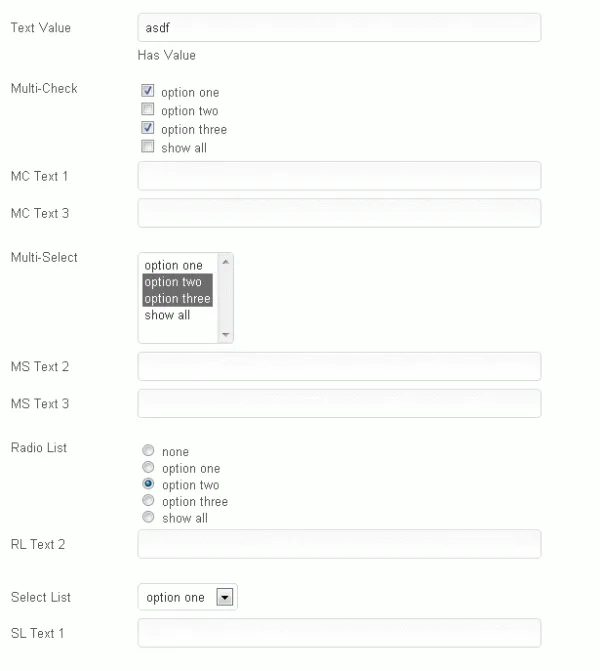 Allows customization of which fields appear or disappear when a key field changes or an option is selected. Based on Show/Hide Dependant Fields 0.03 by Chris, but with more capabilities. Use any field that fires a change event (text, textarea, select, checkbox, radio). Changes cascade, so if a field is hidden and it has rules, those elements are hidden too.