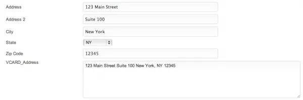 Combines values from address, address_2, city, state, zip fields on record save to created data field for VCARD address. Works in conjunction with the user-submitted "QR Code Generator v1.01".