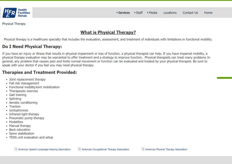 This site promotes the products and services of a regional health care provider. You can schedule visits, sessions and see and learn about all of the offerings of the business.